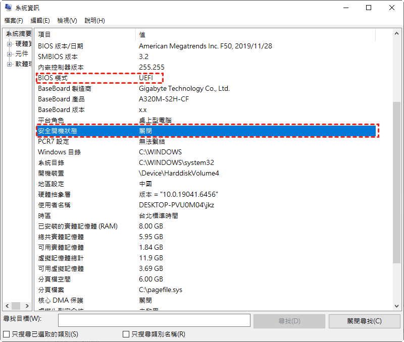 情況1:BIOS模式為UEFI,安全開機狀態為關閉