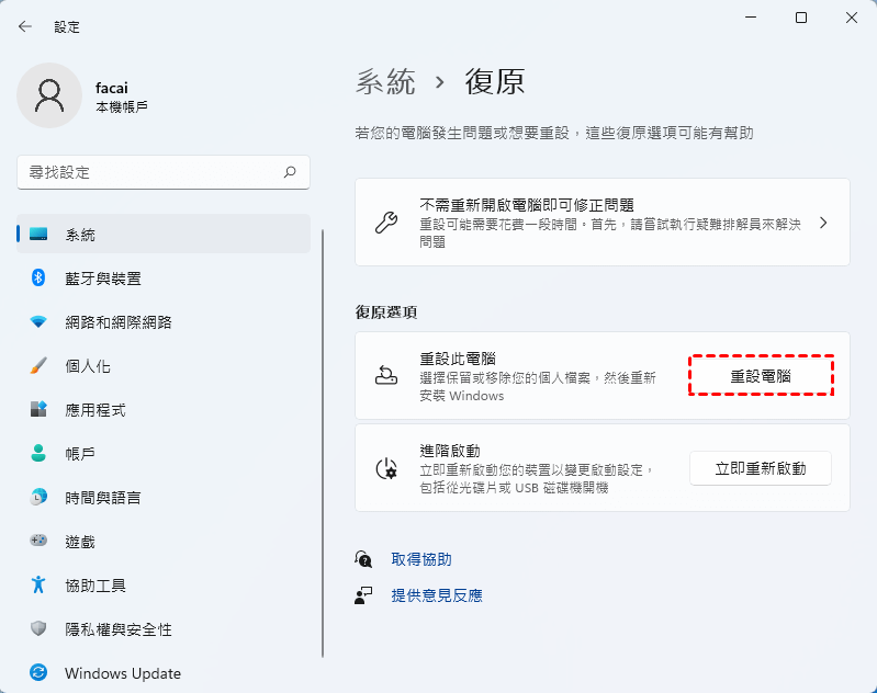 步驟1. 打開“開始”>“設定”>“系統”>“復原”,然後點選“重設電腦”按鈕。