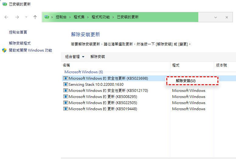 解除安裝Windows Update後,重新啟動系統,看看問題是否解決。