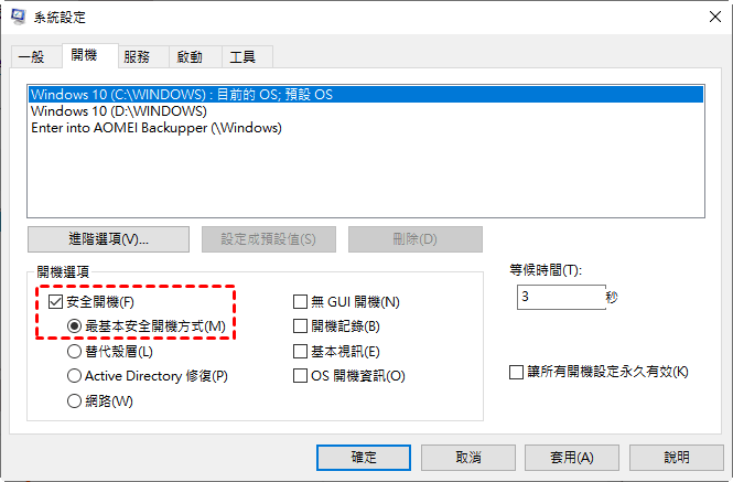 步驟2. 切換到“開機”選項卡,選擇“安全開機”並確保選中“最基本安全開機方式”選項。