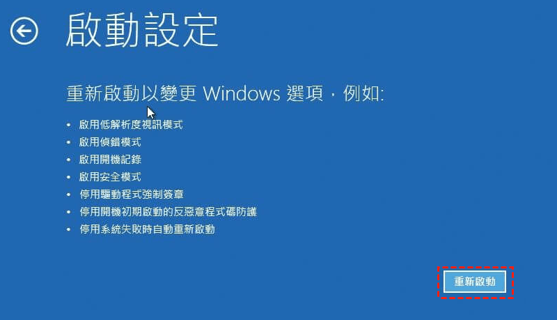 步驟2. 電腦重新啟動至選擇一個選項畫面後,選擇疑難排解>進階選項>啟動設定>重新啟動。
