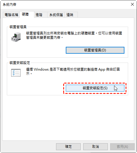 - 選擇硬體選項卡,然後點選裝置安裝設定。