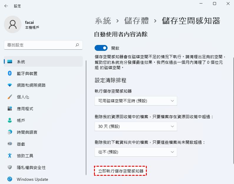 步驟2. 在儲存體管理下,打開儲存空間感知器選項。