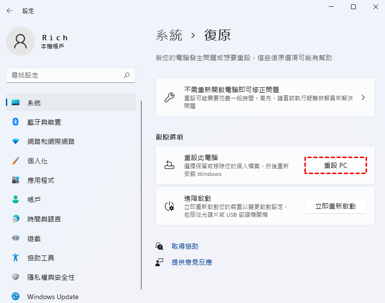 步驟2. 轉至系統 -> 復原。點選復原選項下的重設電腦。