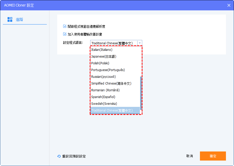 AOMEI Cloner 支援多種語言,包括英語、德語 (Deutsch)、法語 (Français)、日語 (日本語)、義大利語 (Italiano)、荷蘭語 (Dutch)、西班牙語 (Español)、土耳其語 (Türkçe)、波蘭語 (Polskie)、簡體中文 (Simplified Chinese) 和繁體中文 (Traditional Chinese)。