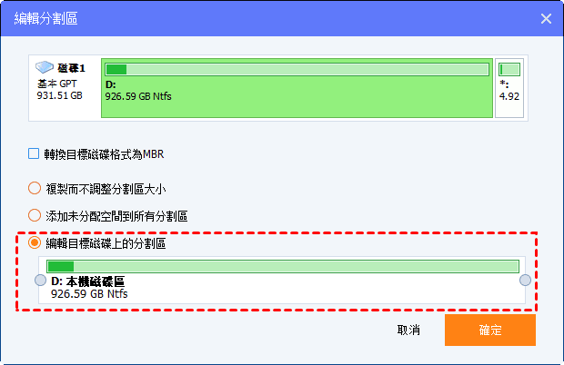 編輯目標磁碟上的分割區:透過拖動滑塊手動調整分割區大小。使用此功能,您可以根據需要輕鬆選擇和修改每個分割區的大小。