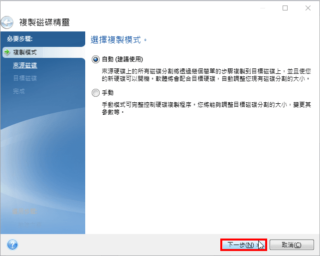 步驟 2. 選擇是使用自動(建議使用)還是手動傳輸模式。然後點選下一步。