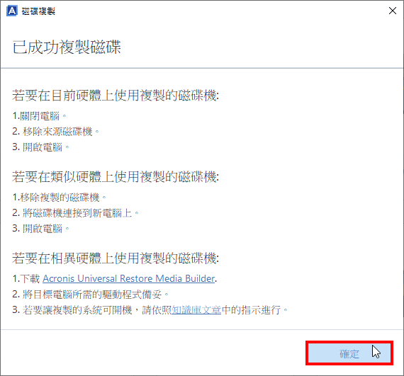 注意克隆的磁碟機在 Windows 中不會有磁碟機代號。從該磁碟機啟動新裝置後,系統將自動為它分配一個代號。