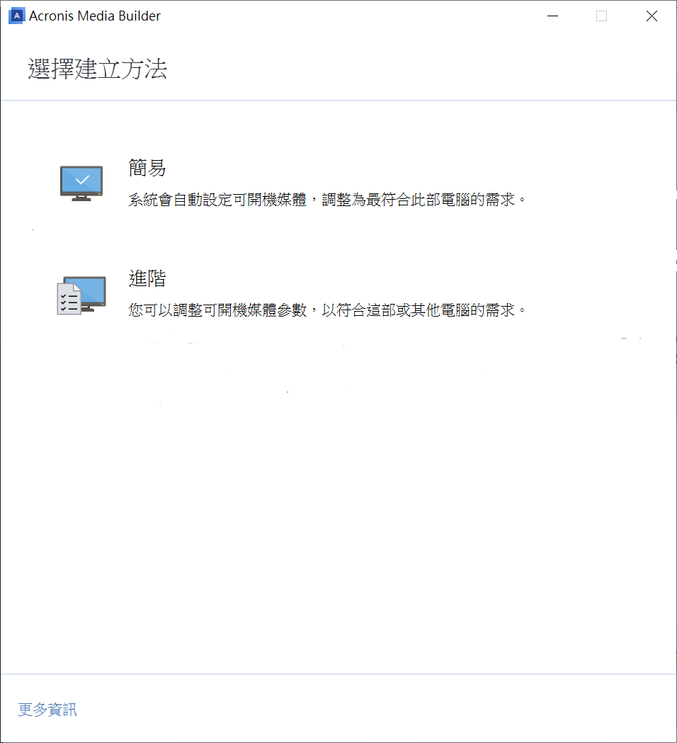 • 簡易—這是最簡單的選項,適合大多數使用者。Acronis True Image 將為您的電腦選擇最佳媒體類型。如果您使用 Windows 7 或更高版本,將創建基於 WinRE 的媒體。否則,Acronis Media Builder 將創建基於 Linux 的媒體。