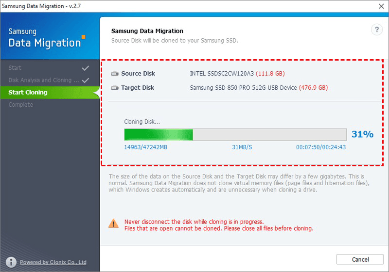 以上就是使用三星資料遷移將Samsung SSD克隆到另一SSD的具體步驟。但在某些情況下這種方法可能會失效。例如當目標硬碟不是三星品牌的產品,或者有時候會出現Samsung Data Migration運行錯誤。