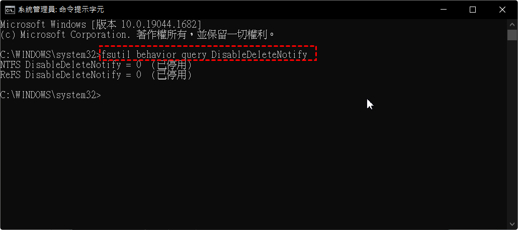 如果不確定是否啟用了 TRIM,則可以使用以下命令進行檢查。命令提示字元需要以管理員身份執行。