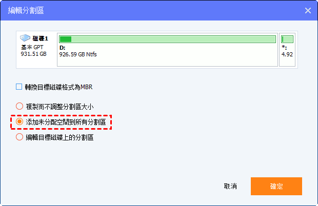 在作業摘要介面,點選編輯分割區按鈕,然後選擇添加未分配空間到所有分割區選項,以便充分使用容量更大的SSD上的儲存空間。