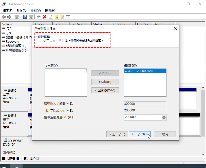 3. 在延伸磁碟區精靈視窗,請點選“下一步”。接著選擇磁碟與要擴充的分割區大小。