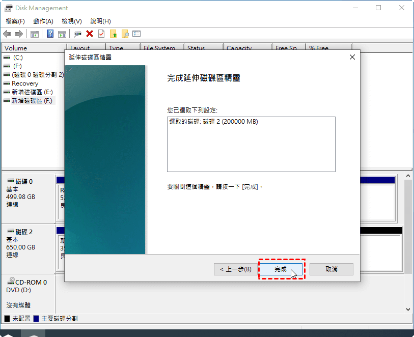 4. 點選“完成”。之後就可以看到克隆分割區整個變大了。