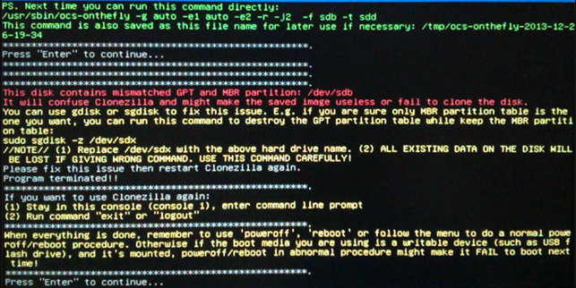 使用 Clonezilla獲取此磁碟機的備份映像是我首選的備份方法,然而它報告以下錯誤:“此磁碟包含不匹配的 GPT 和 MBR 分割區:/dev/sda”