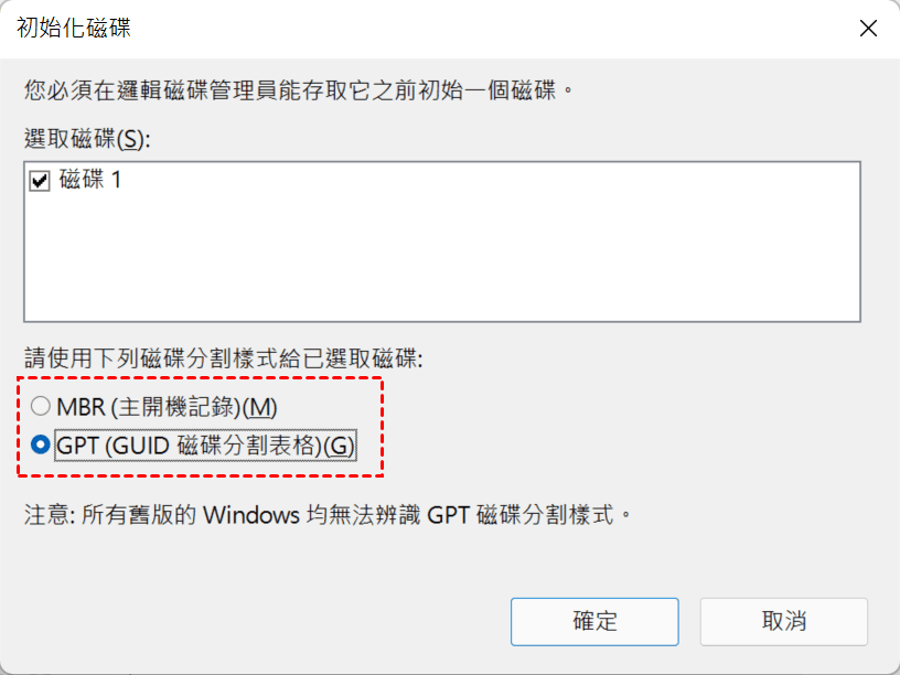 4、完成新硬碟初始化:於 Windows 搜尋列輸入「diskmgmt.msc」開啟磁碟管理,對新硬碟按右鍵選擇【初始化磁碟】。請根據原系統的開機模式選擇分割區樣式:傳統 BIOS 對應 MBR,UEFI 則建議選用 GPT