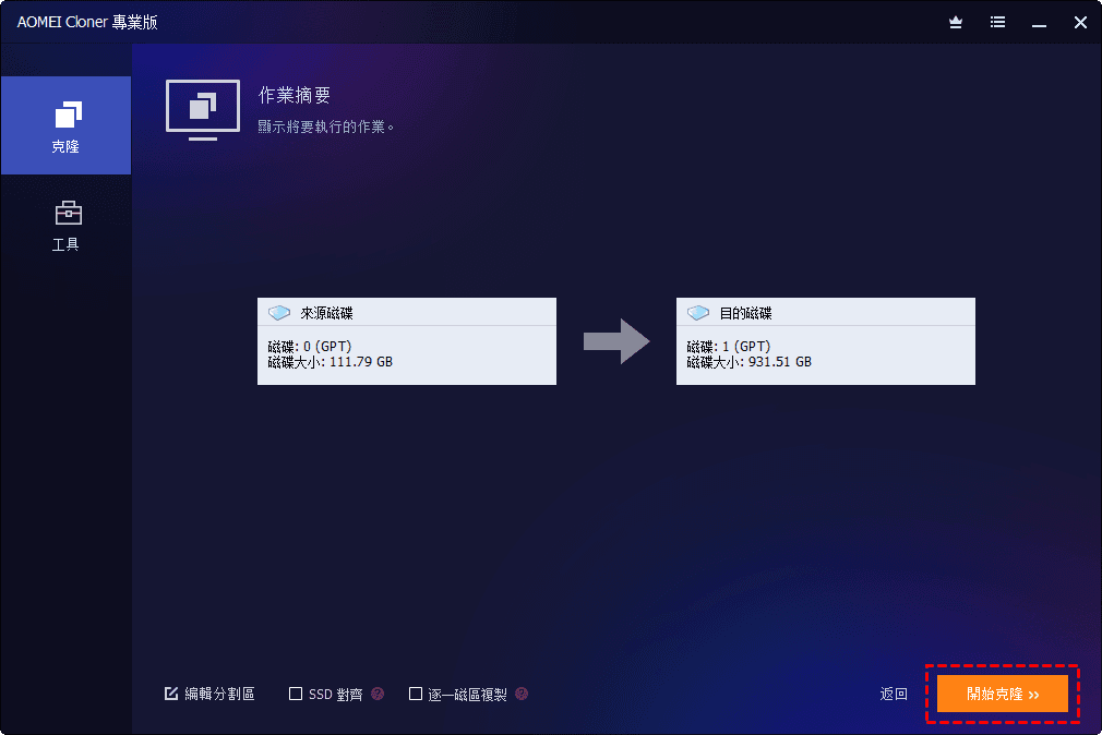 | 磁碟克隆 | 編輯分割區、逐一磁區克隆、 SSD 對齊 |