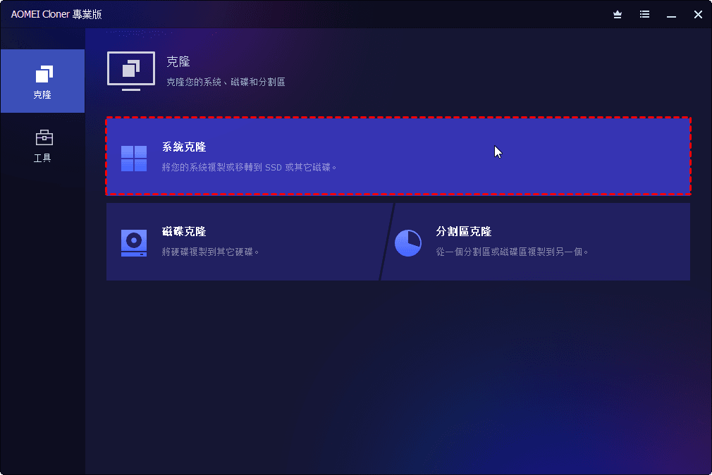 AOMEI Cloner 是一個可以滿足您所有克隆需求的專業軟體。它提供了可靠的磁碟克隆和系統克隆功能,並支援所有 Windows 作業系統以及硬碟品牌,無論 SSD 還是 HDD 都能輕鬆複製所有資料。
