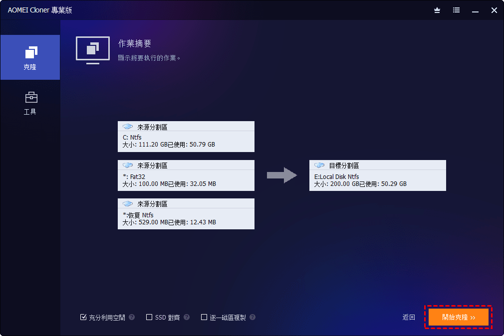 您已從此頁面中學到了磁碟克隆與系統克隆相關的知識。而最好的克隆軟體 AOMEI Cloner 可以幫助您完美地完成這兩項任務。除此以外, AOMEI Cloner 還提供了分割區克隆功能,它可以直接克隆重要分割區,可滿足您的各種克隆需求。