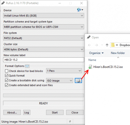 1. 從其官方網站下載Hiren’s BootCD ISO檔案。然後您需要將ISO檔案燒錄到CD/DVD/USB磁碟機上以啟動電腦。這裡我以將ISO檔案燒錄到USB磁碟機上為例。下載免費的燒錄軟體Rufus來幫助您完成此操作。您還可以選擇其他燒錄軟體,如UltraISO、Nero、BurnAware Free和Free ISO Burner。