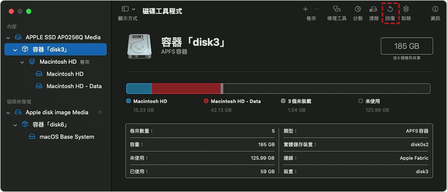 步驟5. 在“磁碟工具程式”視窗中點選“回復”。