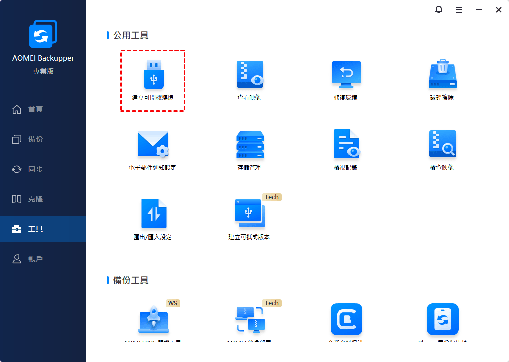 步驟2. 備份過程完成後,點選工具並選擇建立可開機媒體以匯出 ISO 檔案。