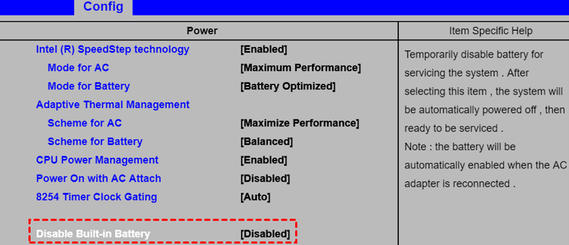 重啟進入BIOS,然後進入配置 >電源>關閉內建電池並按F10儲存更改並退出。這將關閉筆電。