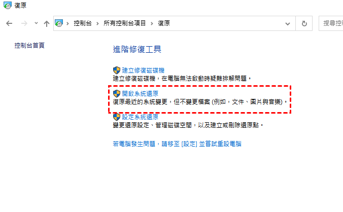 - 系統還原只能在資料夾/檔案遺失之前建立的系統還原點上有效。