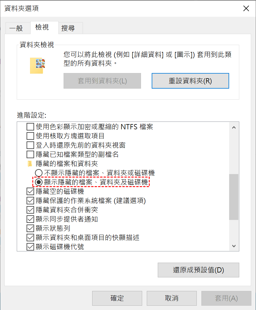 步驟3.在“檢視”介面中,選擇“隱藏的檔案、資料夾和磁碟機”下的“顯示隱藏的檔案、資料夾及磁碟機”,然後點擊“套用”>“確定”。
