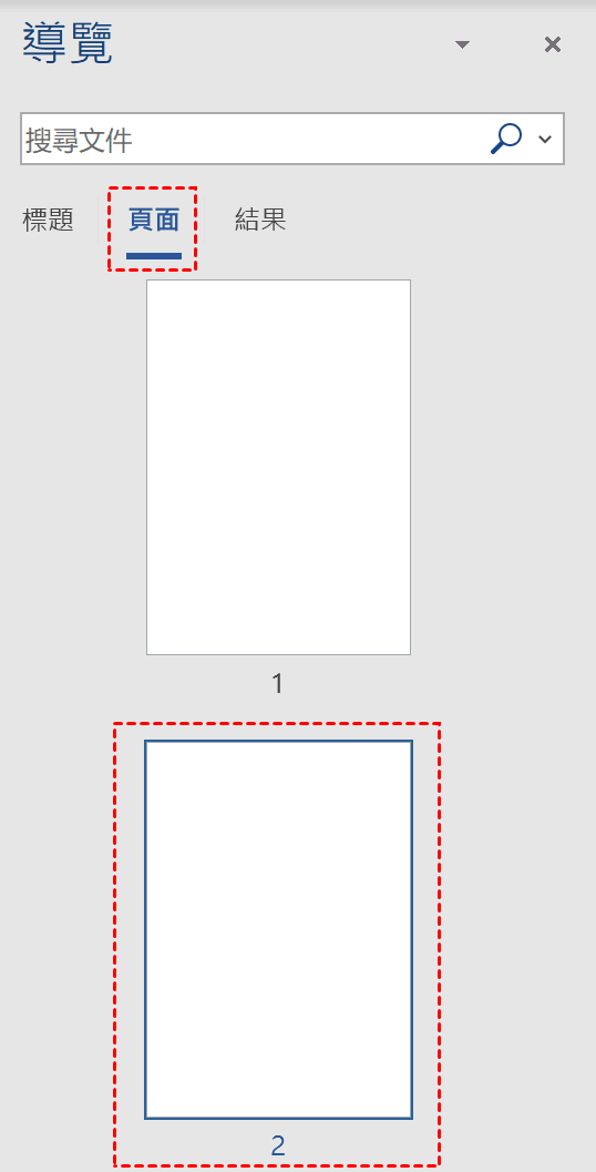 2、從「導覽」部分,切換到「頁面」標籤,您可以檢視到當前 Word 所有頁面。選取您想要刪除的空白頁面,再按下鍵盤上的Delete鍵即可快速刪除 Word 空白頁。