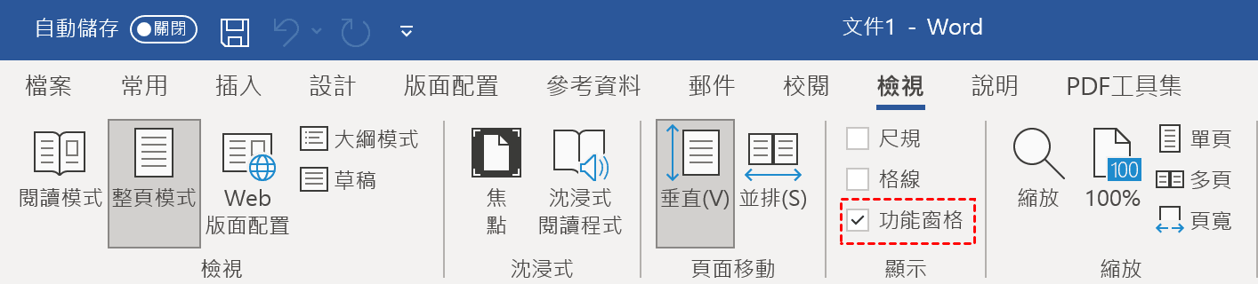 1、打開 Word ,從頂部的工具列中找到並點擊「檢視」>「功能窗格」核取方塊。