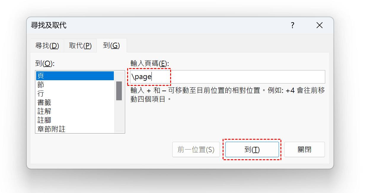 3、找到「輸入頁面」部分,輸入「\page」,再點擊下方的「到」按鈕。