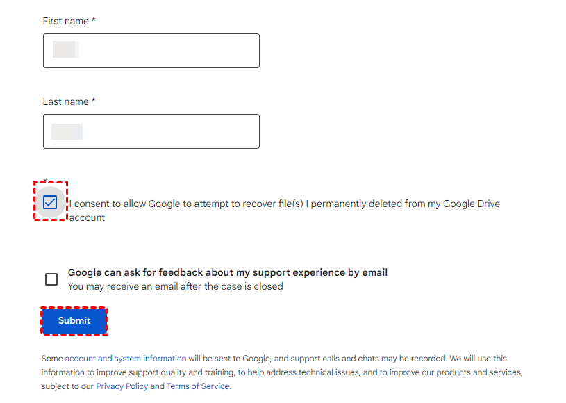 2. 填寫必填的內容後,勾選“我同意並允許 Google 嘗試恢復我的 Google 雲端硬碟帳戶中永久刪除的檔案”核取方塊,點選提交按鈕。
