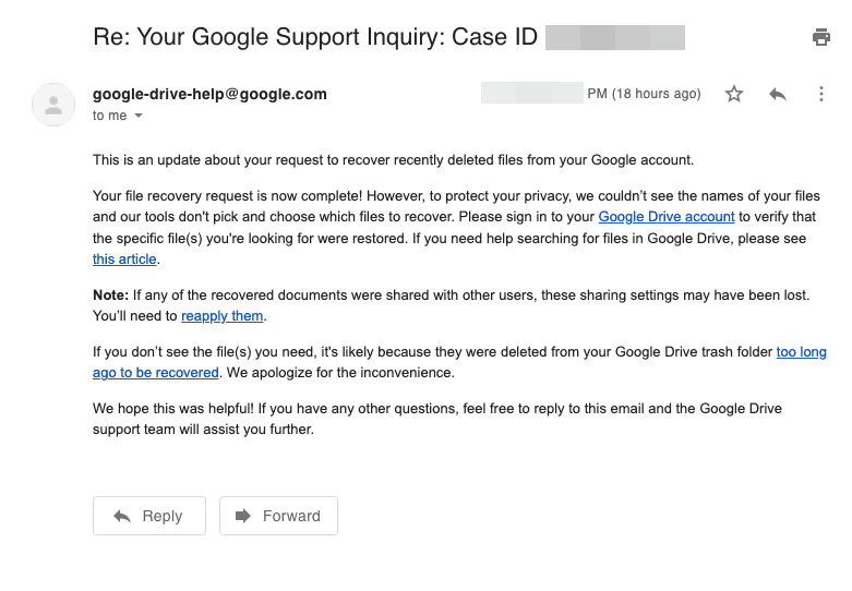 3. 等待12-48小時後,您將收到來自Google雲端硬碟的回覆。以驗證Google雲端硬碟是否可以復原永久刪除的檔案。