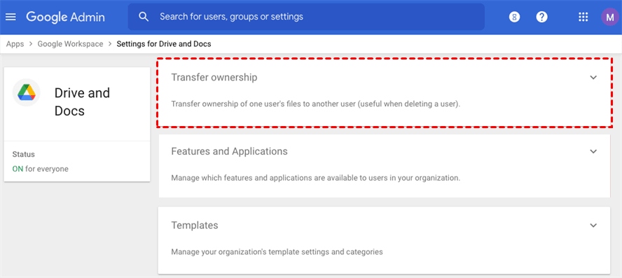 2. 前往應用程式 > G Suite > 雲端硬碟和文檔,然後從清單中選擇轉移所有權。