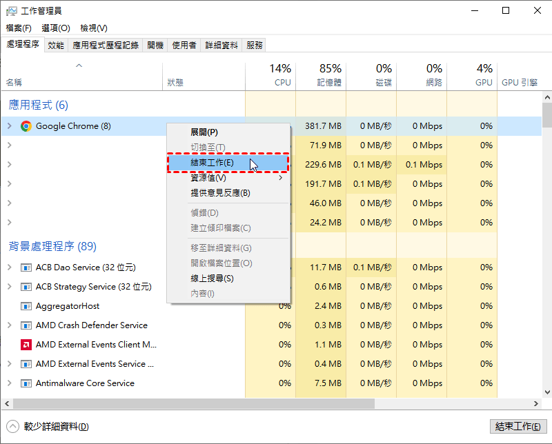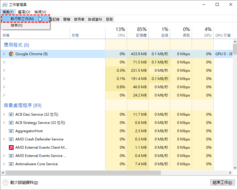 步驟1. 按下Ctrl + Shift + Esc快速鍵開啟「工作管理員」。