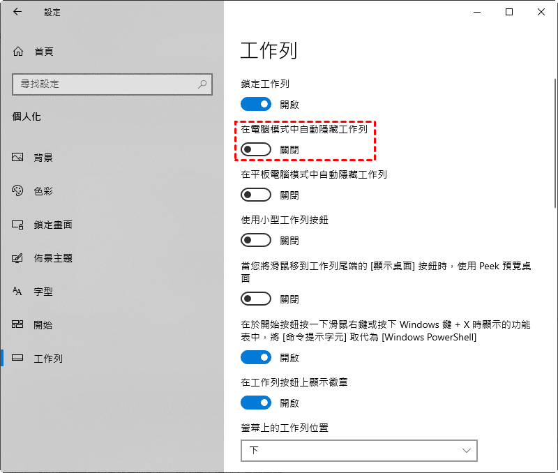 步驟2. 從視窗左側選擇「工作列」,從視窗右側將「在電腦模式中自動隱藏工作列」切換為「關閉」狀態。
