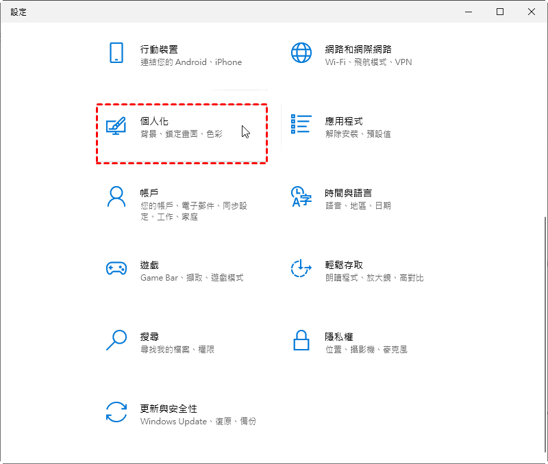 步驟1. 按下Win+I快速鍵開啟Windows設定,找到並點擊「個人化」。
