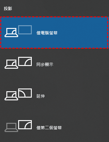您只需:按下Win+P快速鍵開啟投影設定,並選擇「僅電腦螢幕」選項。