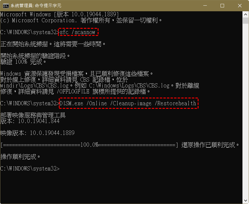 步驟3. 等待此過程完成,再將電腦重開機並檢查錯誤是否已修復。