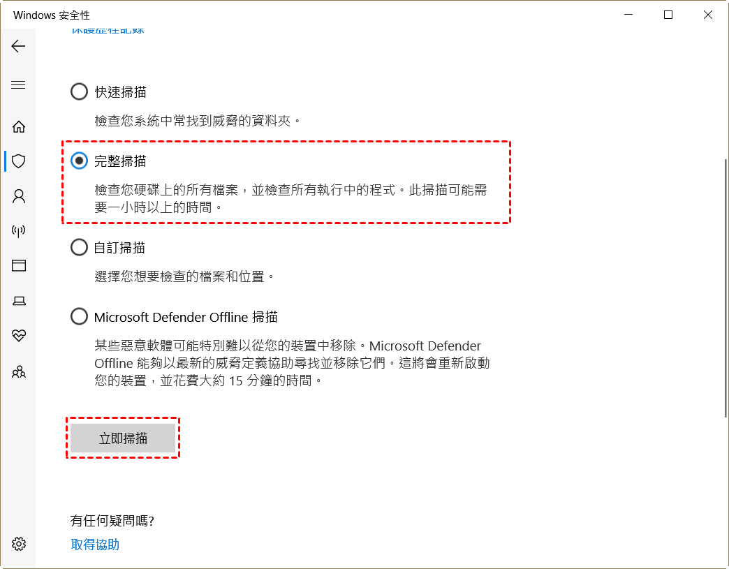 步驟3. 切換為「完整掃描」後,再點擊「立即掃描」按鈕。如果有掃描到任何病毒或惡意軟體,請立即清除它們。