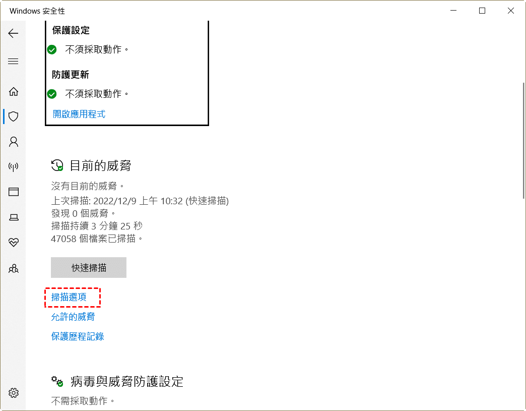 步驟2. 找到並點擊「病毒與威脅防護」選項,再點擊「掃描選項」。