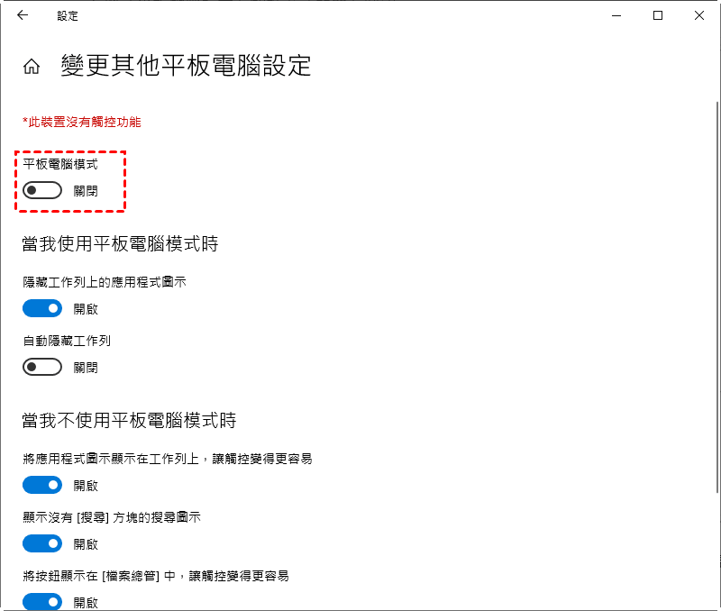 步驟3. 將「平板電腦模式」切換為「關閉」狀態。