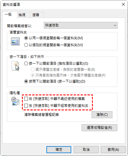步驟 2. 在「一般」標籤頁下,取消選中「在快速存取中顯示最近使用的檔案」和「在快速存取中顯示經常使用的資料夾」兩個選項,然後點擊「確定」或「套用」。