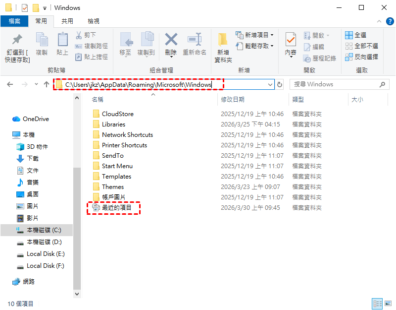 「C:\Users\UserName\AppData\Roaming\Microsoft\Windows」並按「Enter」鍵。然後就可以在快速存取中看到最近的資料夾了。