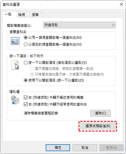 如果最近的檔案沒有顯示在快速存取中,您還可以還原資料夾預設值。只需按照前一種方法打開快速存取「一般」標籤頁,點選「還原成預設值」即可。