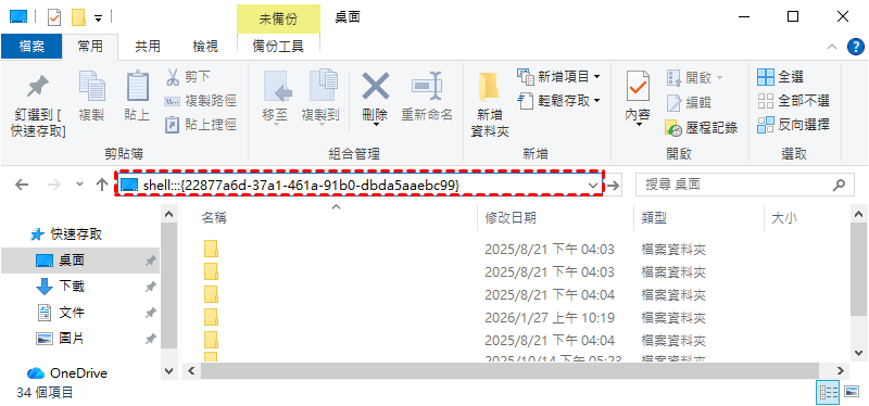 步驟1.如果「快速存取」裡面找不到「最近的資料夾」,或是發現它突然不見了,可以試試看這樣做:在檔案總管的網址列輸入這串指令:shell:::{22877a6d-37a1-461a-91b0-dbda5aaebc99}。照著輸入後按 Enter,就可以開啟隱藏的資料夾了。