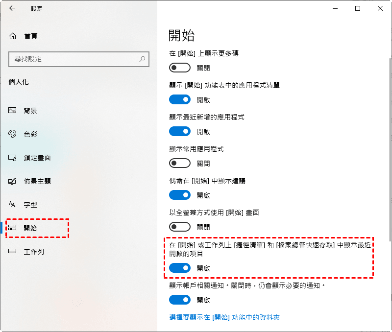 步驟 2.然後打開「在開始或工作列上捷徑清單和檔案總管快速存取中顯示最近開啟的項目」按鈕。