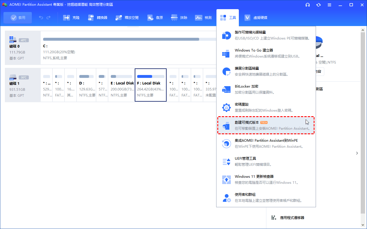 若想在 USB 上隨時使用 AOMEI 分割區軟體,請升級至 AOMEI 分割區軟體 Technician 版本。它提供了一個「建立可攜式版本」功能,可以幫助您將 AOMEI 分割區軟體直接裝進 USB 隨身碟,以便隨時使用它來管理分割區或修復各種磁碟錯誤。