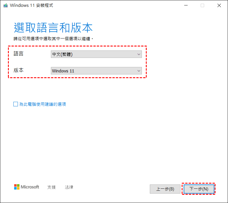 步驟 3. 選擇語言與版本:通常預設會幫你選好,如果沒問題就直接按「下一步」。如果要幫別人安裝或換語言,也可以取消勾選「使用這台電腦的建議選項」來手動調整。